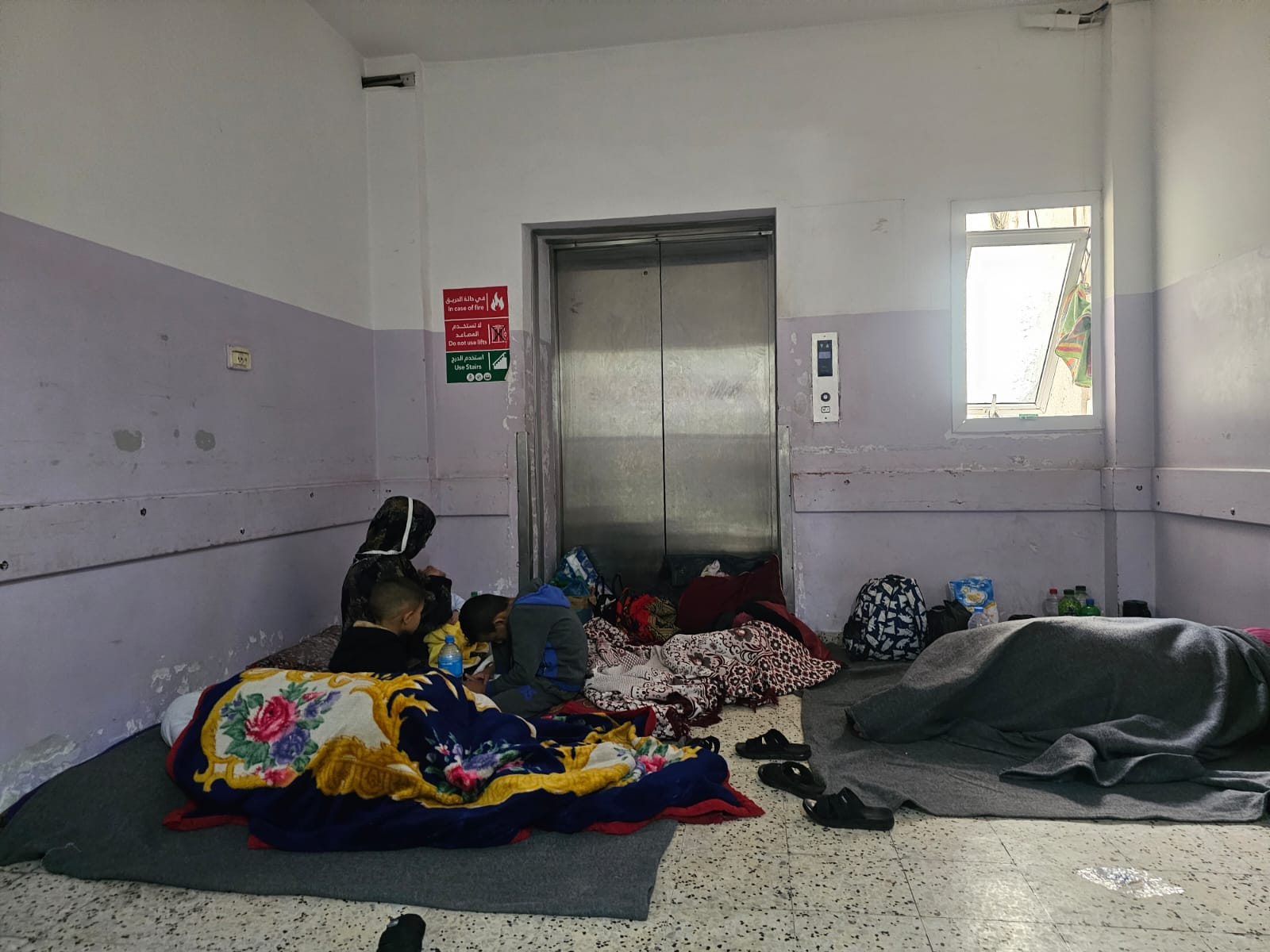 في زاوية المستشفى جنوب قطاع غزة وعلى باب المصعد تحديدا كانت تفترش الأرض، ينكمش صغارها حولها من شدة البرد، كانت تحاول إطعام رضيعها ما توفر من الحليب الصناعي، فهي لا تستطيع إرضاعه بسبب سوء التغذية.