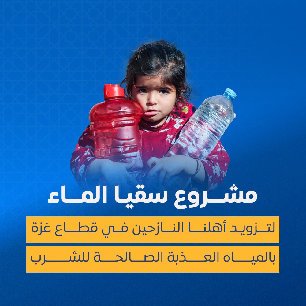 يمول هذا المشروع تجهيز وتزويد 5 محطات تحلية مياه بالطاقة الشمسية ، ويمول أيضا عملية شراء ونقل 4 مليون لتر مياه عذبة صالحة للشرب بواقع 1000 عربة في كل عربة 4 آلاف لتر مياه لأهلنا النازحين في مراكز الإيواء والأحياء لمدة شهرين كاملين.